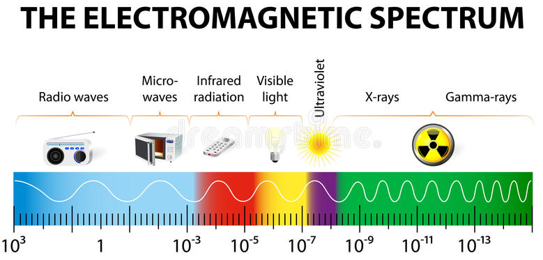 Infrared radiation is invisible to us. What I mean by that is that it can’t be seen by the unaided human eye. Infrared cameras, through the use of special lenses, filters, and processing, allow us the ability to see inside the “infrared spectrum”. Just like visible light, infrared radiation resides on what is called the electromagnetic spectrum. Visible light (what we can see with our eyes) is actually a very small part in the middle of the known electromagnetic spectrum. Infrared radiation lies just below (longer wavelength) visible light on the spectrum shown below.